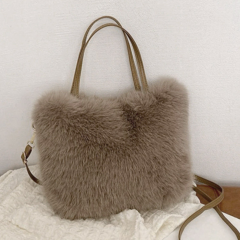 Женская сумка из мягкого пушистого материала ( искуственный мех)  с двумя ручками и дополнительным длинным ремнём через плечо.