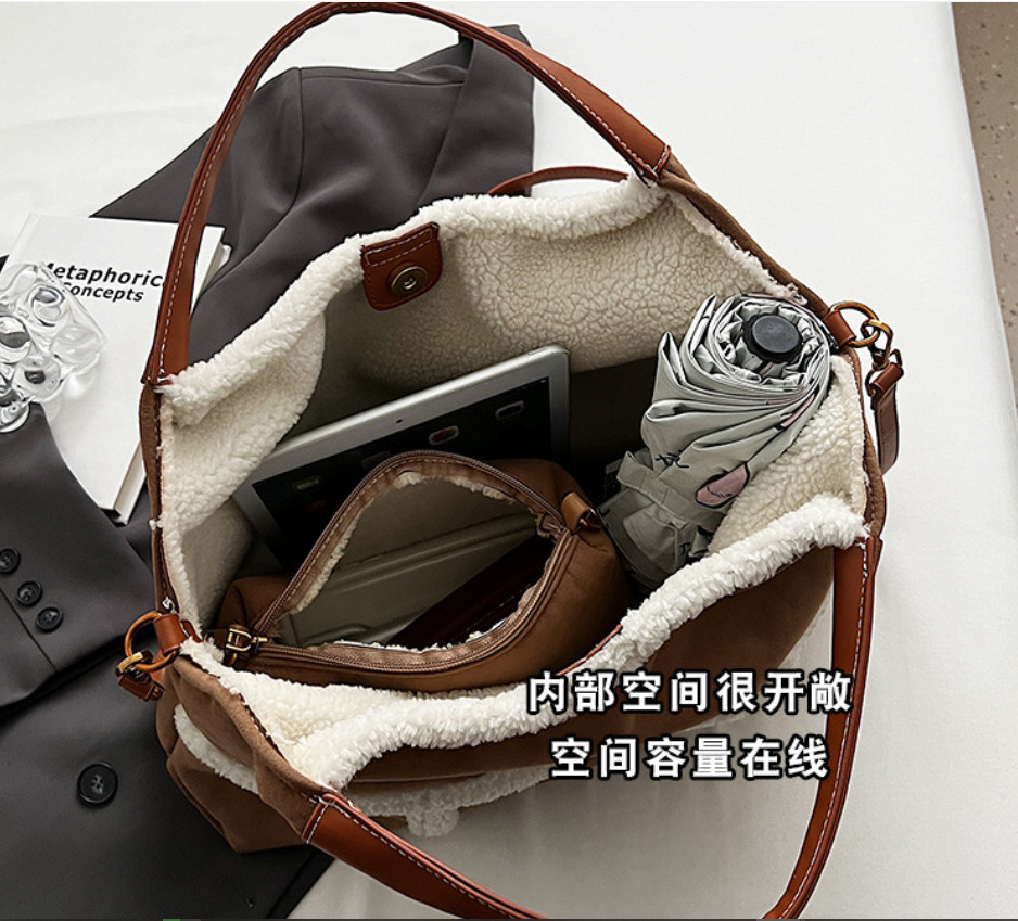 Трендовая коричневая сумка с белой меховой отделкой по краям и полностью меховой подкладкой внутри.