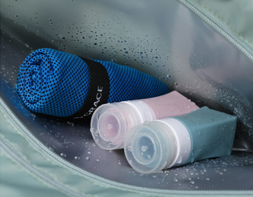 - внутри имеет водонепроницаемый карман для мокрого полотенца и душевых принадлежностей