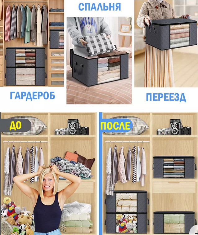 Вместительный и аккуратный короб для хранения одежды, постельного белья и текстиля. Помогает навести порядок в шкафу, гардеробной или кладовой и быстро находить нужные вещи.