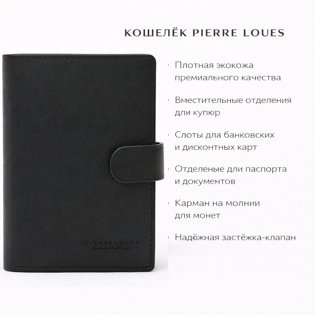Внутри: множество отделений для купюр, монет и банковских карт, документов.