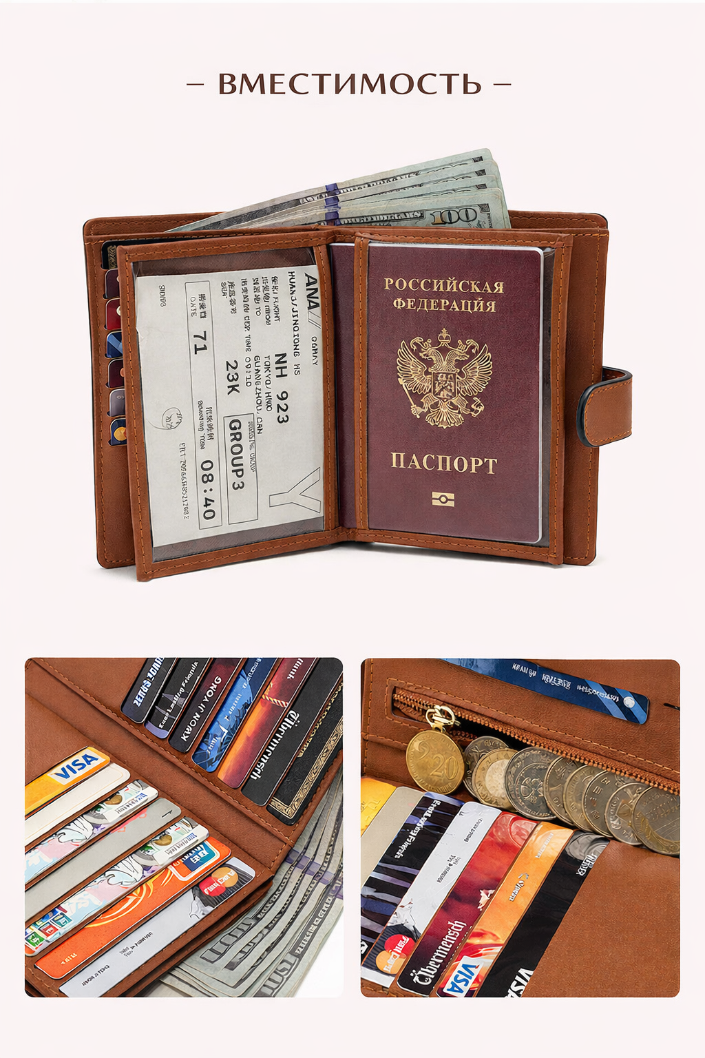 Внутри: множество отделений для купюр, монет и банковских карт, документов.